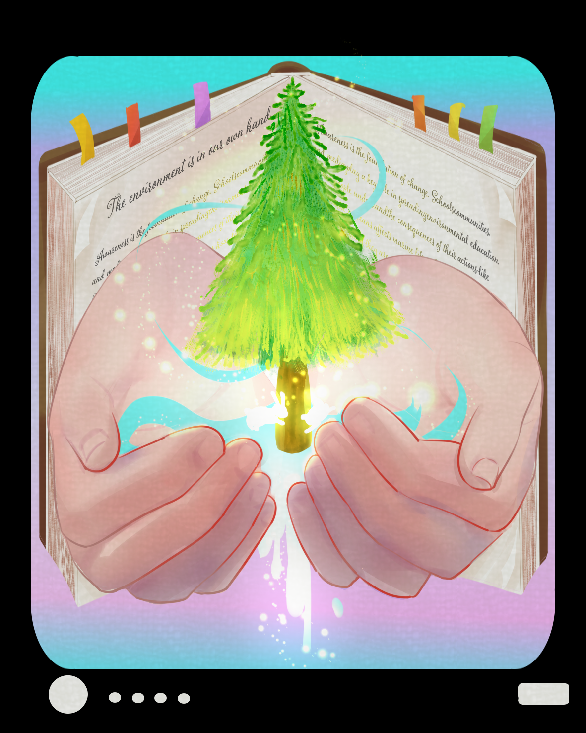 In terms of design, I framed the composition inside a television to make it resemble a program, reminding viewers that environmental issues are part of our daily narrative. For the central image, I depicted hands emerging from an open book and holding a tree, symbolizing that our survival depends on our own hands to sustain and protect the environment. At the base of the tree, I placed two rabbits happily playing, representing a world where nature thrives in harmony with human life.