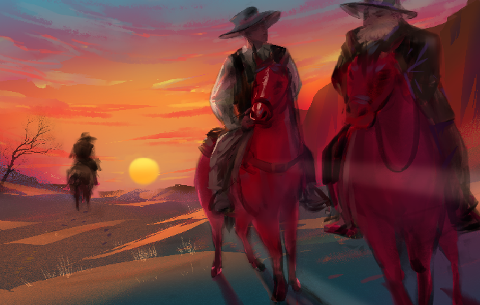 This illustration was inspired by a scene from The Wild Bunch. In the original moment, a cowboy must part ways with two of his companions. In a desert ravaged by war and violence, no one can be sure if they’ll ever meet again.